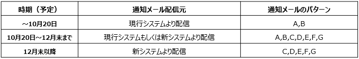 2025年10月20日から12月末(予定)の期間においては、現行システムからの通知メール(A,Bのパターン)及び新システムからの通知メール(C~Gのパターン)が混在する場合がございます。システム切替完了以降は、新システムより通知メール(C~Gのパターン)が配信されます。