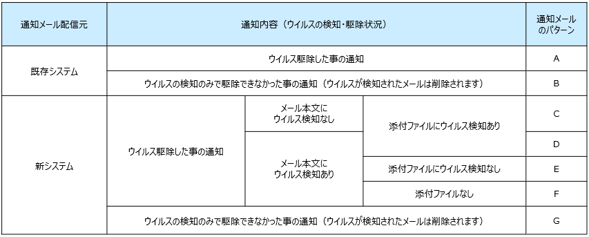 既存システムではA,Bパターンの通知メールが配信されておりますが、新システムではウイルスの検知、駆除状況によりC~Gパターンの通知メールが配信されます。